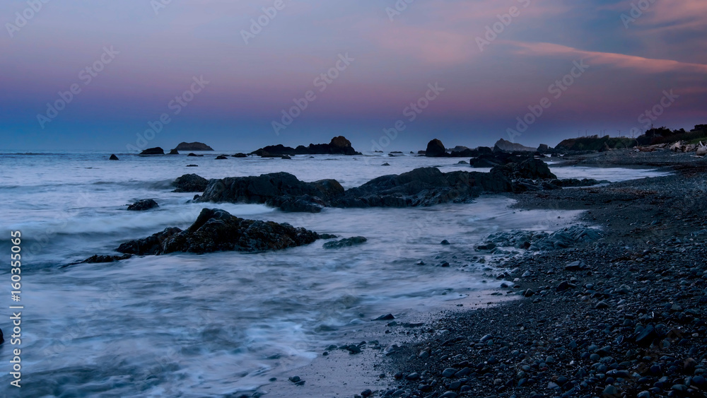 Beach in Crescent City, California, USA, during a low tide, in the early morning, near the Battery Point Lighthouse