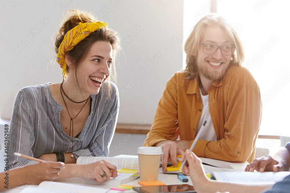 Pleased female in shirt and yellow scarf on head and bearded male with glasses sitting at their working place surrounded with books drinking takeaway coffee having good mood. Emotions and friendship