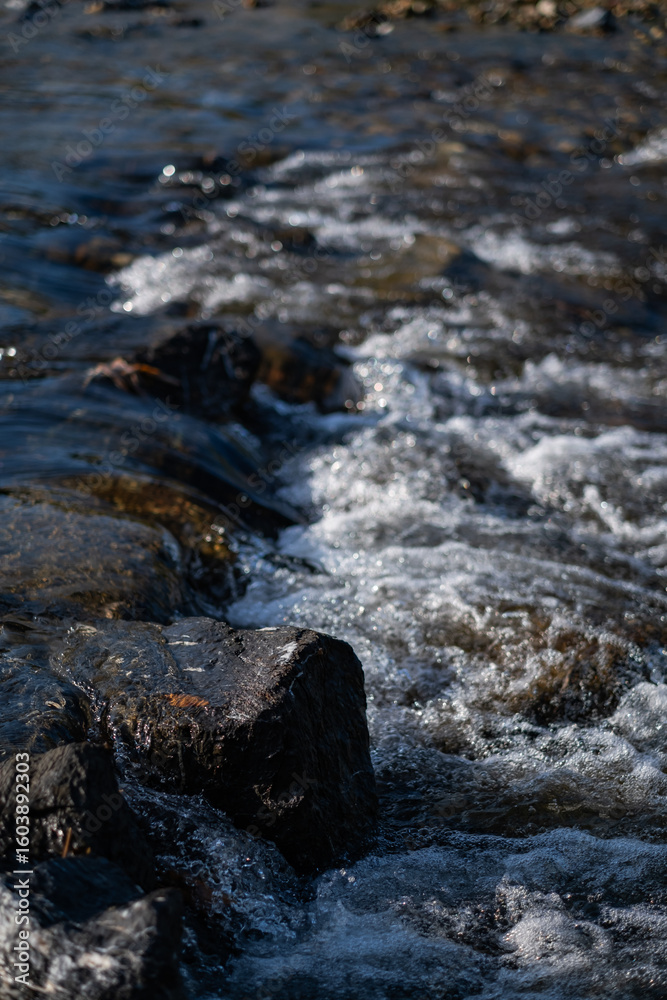 The river rushed over the rocks, creating a spray of mist in the bright sunlight. The spray sparkled in the sun, creating a beautiful sight.