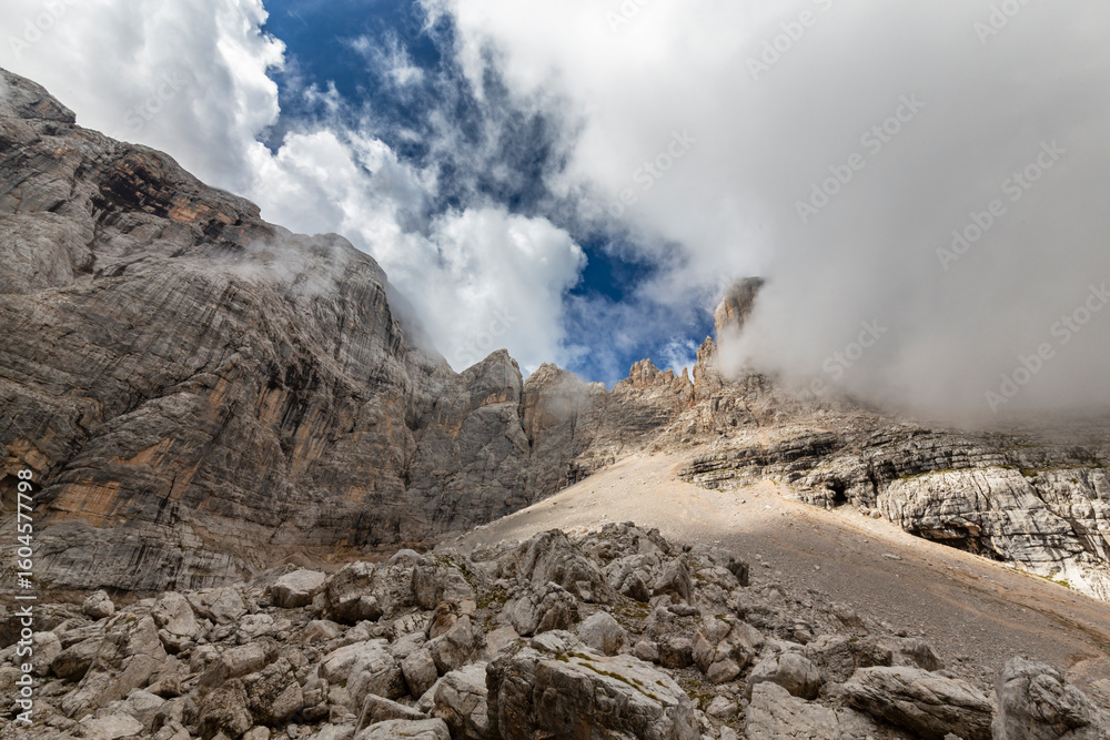 Dramatic storm clouds up in the Dolomite mountains, Italy, in summer