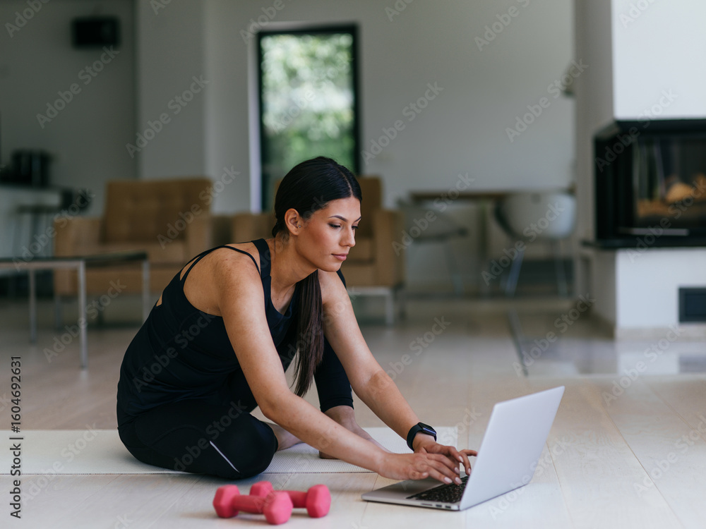 A young woman in sportswear is sitting in the living room and preparing for online training while using a laptop.