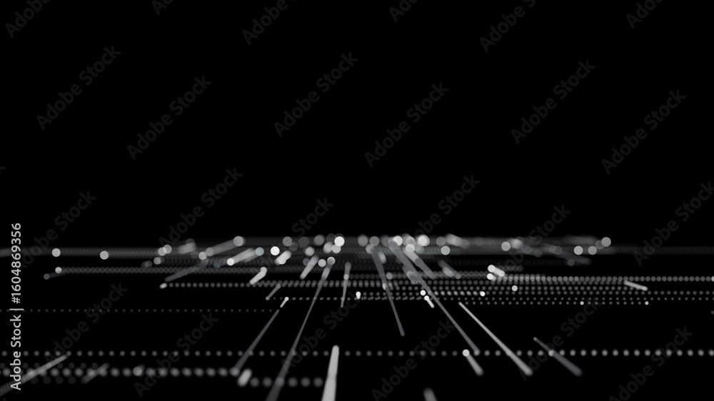 Futuristic abstract digital background with glowing white dots and lines on black, representing data transmission, AI, and modern technology.