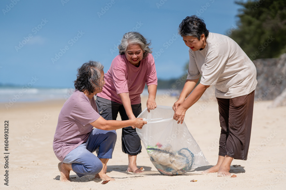 A group of older people are picking up trash on the beach to help keep nature clean and beautiful.