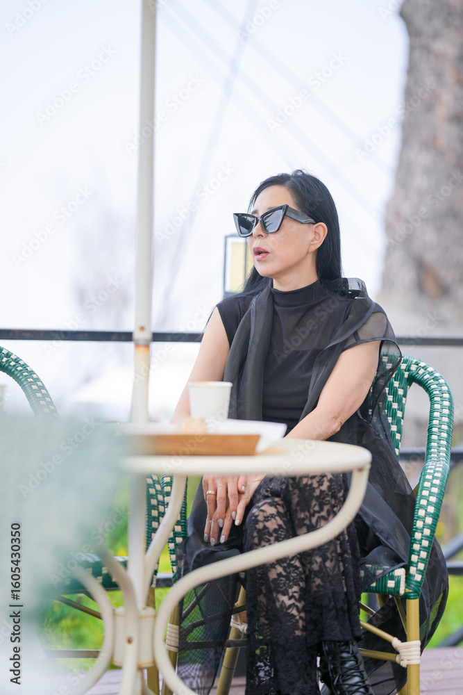 A Korean man and woman in their late 50s enjoy coffee and cake at a seaside cafe terrace with parasols. The scene is calm and peaceful, touched by the early summer breeze. Incheon, South Korea.