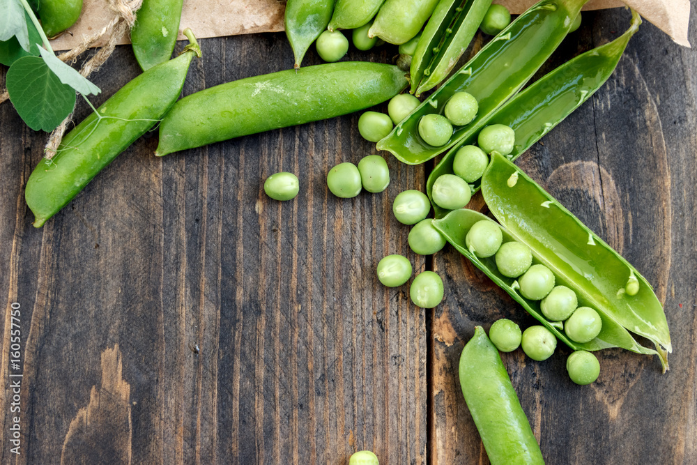 Горох и стрючки гороха на темном фоне. Концепция здоровое питание.