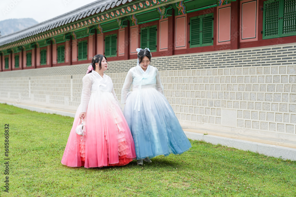 In June in Seoul, two Korean women in their twenties walk across the grassy lawn before the long stone wall of Gyeongbokgung Palace, wearing cute sky-blue and pink hanbok under a clear summer sky.