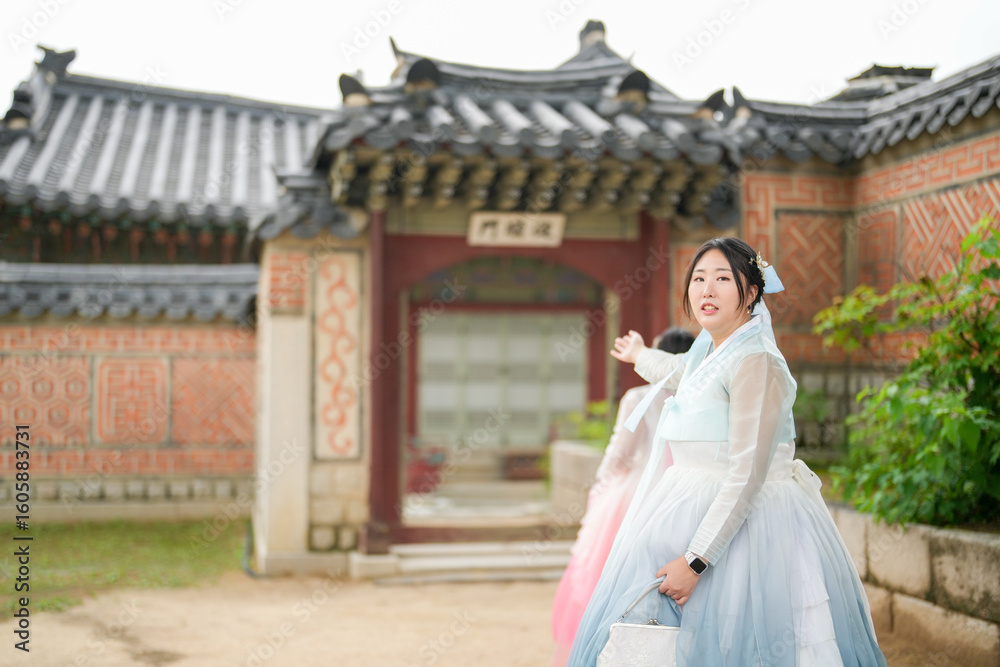In Seoul in June 2025, two Korean women in their twenties wearing pink and sky-blue hanbok stand in front of the traditional brick gate of Gyeongbokgung Palace, their poise echoing ancient grace.