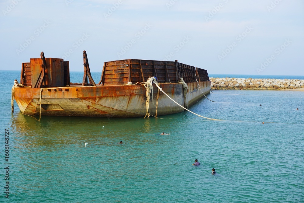 A barge stranded in coastal waters off Seberang Takir, Kuala Terengganu. Tongkangs are typically large, wooden boats with flat bottoms, designed to carry heavy loads, especially in shallow waters.