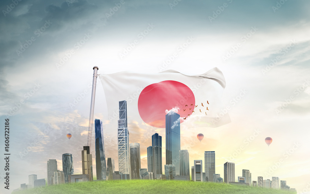 Japan national flag wavering with modern building skyline. Country showing stronger and prosperity. Flag key visual. Japan national flag for independence day.