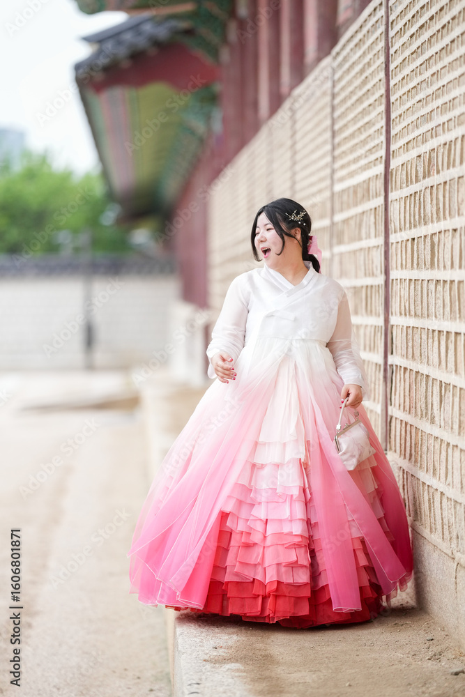 A Korean woman in her twenties wearing a charming pink hanbok walks in front of the traditional stone wall of Gyeongbokgung Palace, her steps softly echoing ancient history, in Seoul in June 2025.