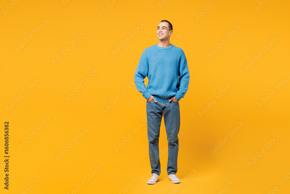Full body young smiling happy cheerful middle eastern man wearing blue sweatshirt casual clothes stand look aside on area isolated on plain yellow orange background studio portrait. Lifestyle concept.