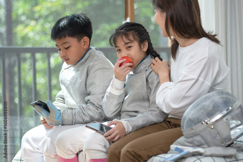 The fencer relaxes by spending time on his cell phone and eating an apple while his mother looks after them. Caring for growing children