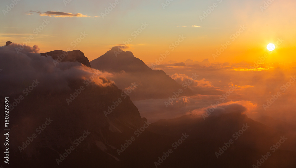 Picturesque sunrise colors in the Dolomites Mountains, Italy, in summer