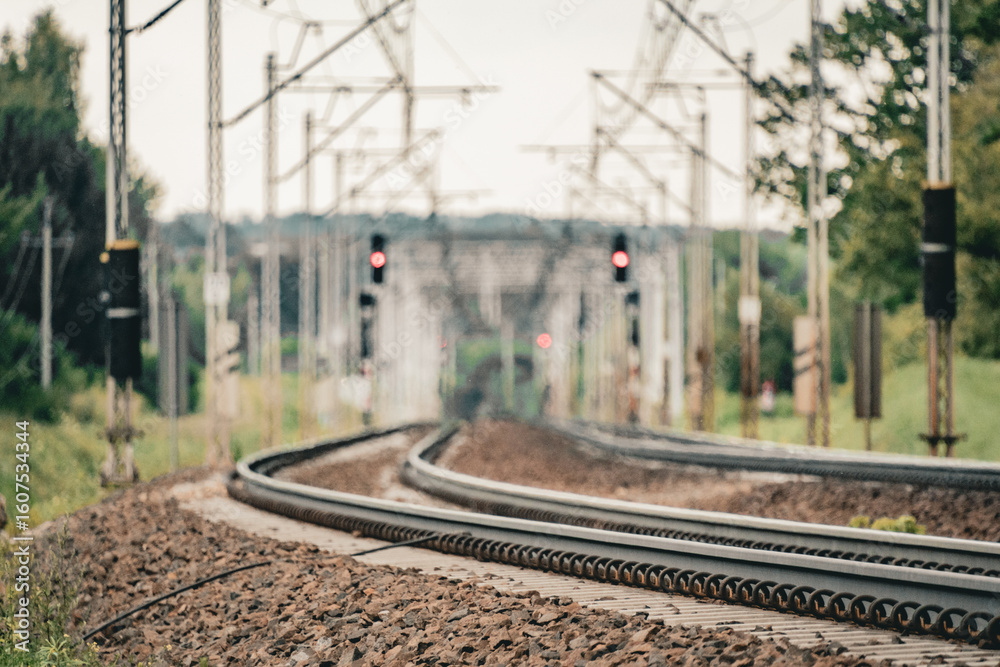 Curved railway tracks extending into the distance, both rails clearly visible, forming a dynamic perspective. A clean composition capturing movement and direction