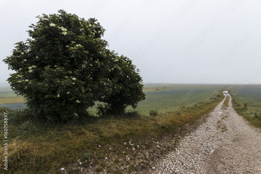 A country road disappearing into distant mist and fog, with a tree on the side