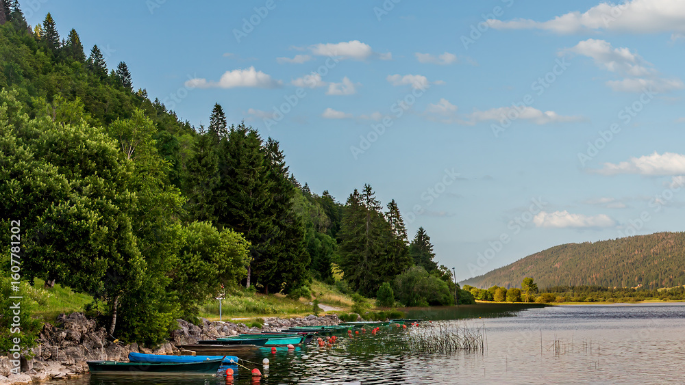 Rowboats in Lac des Rousses, forest and mountain in Summer. Les Rousses, Jura, France.