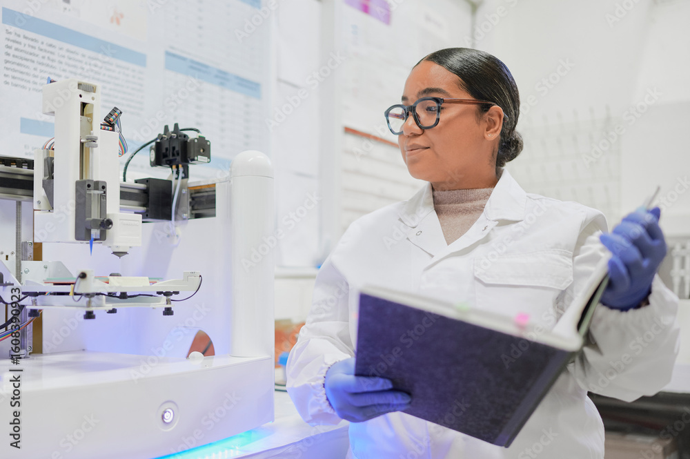 Scientist from the Dominican Republic observes the progress of a working 3D printer in her research lab, wearing a lab coat and focused on the advanced equipment