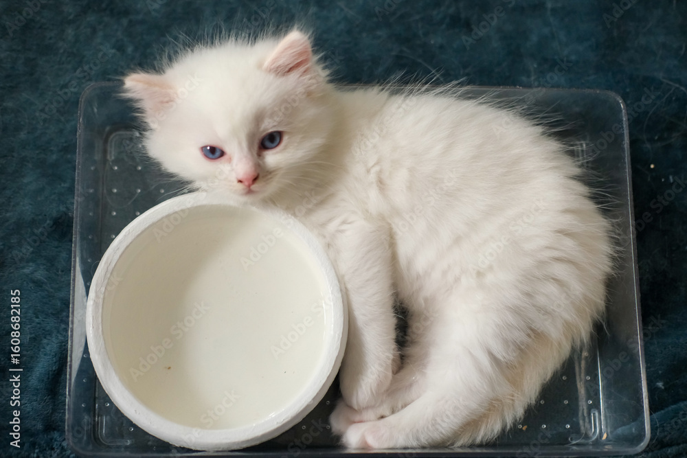1 month old ragdoll kitten lying in a clear box with water bowl
