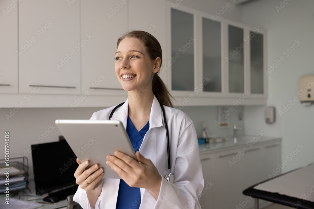 Cheerful young female doc using modern technology in work office, holding digital tablet, standing in clinic examination room alone, looking away, smiling, laughing. Candid shot with copy space