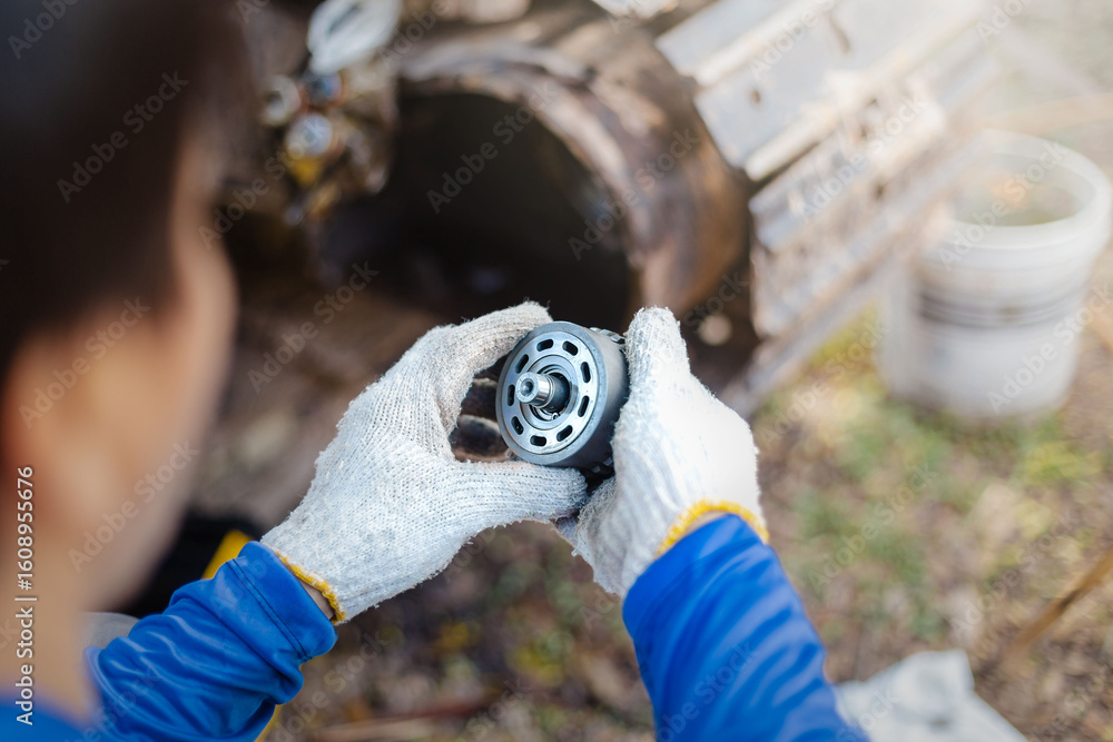 Professional mechanic man holding piston of the hydraulic pump to inspection and repair maintenance heavy machinery Close-up. Compliance and integrity control of the new spare part.