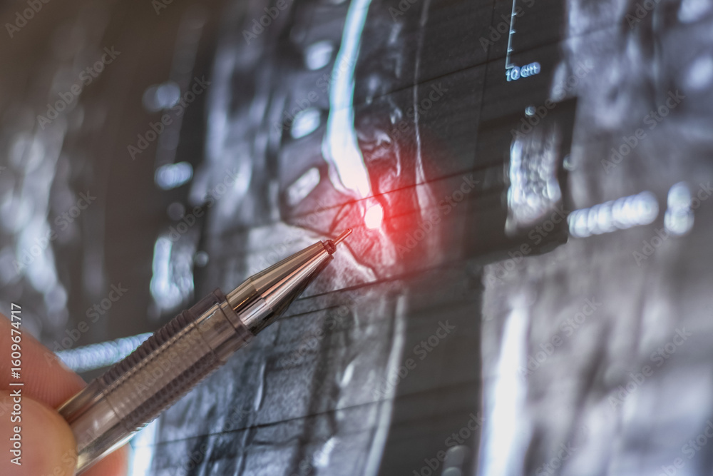 Doctor learning MRI of the lumbar spine. At level 12, an arachnoid cyst measuring 13x14 mm is identified on the left.