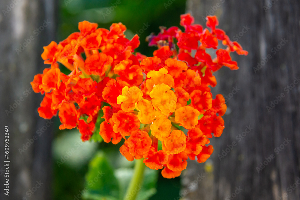 Lantana camara flower or Spanish flag, with red and yellow colors against a dark background, which highlights the flower's vivid colors.