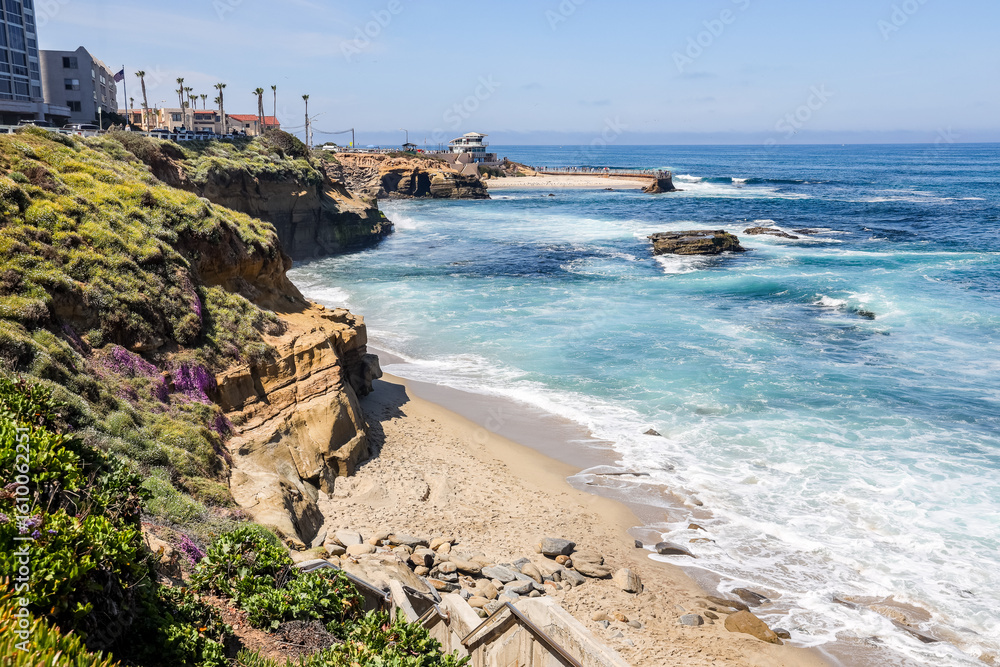 Shell Beach, in La Jolla, California, with the La Jolla Children's Pool and lifeguard station in the background.