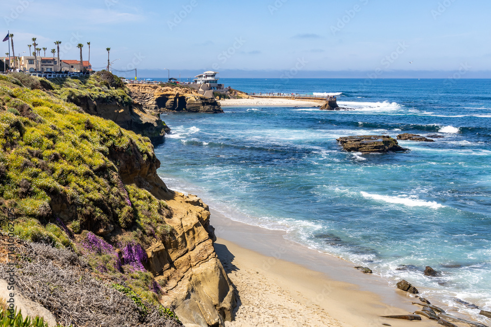 Shell Beach, in La Jolla, California, with the La Jolla Children's Pool and lifeguard station in the background.