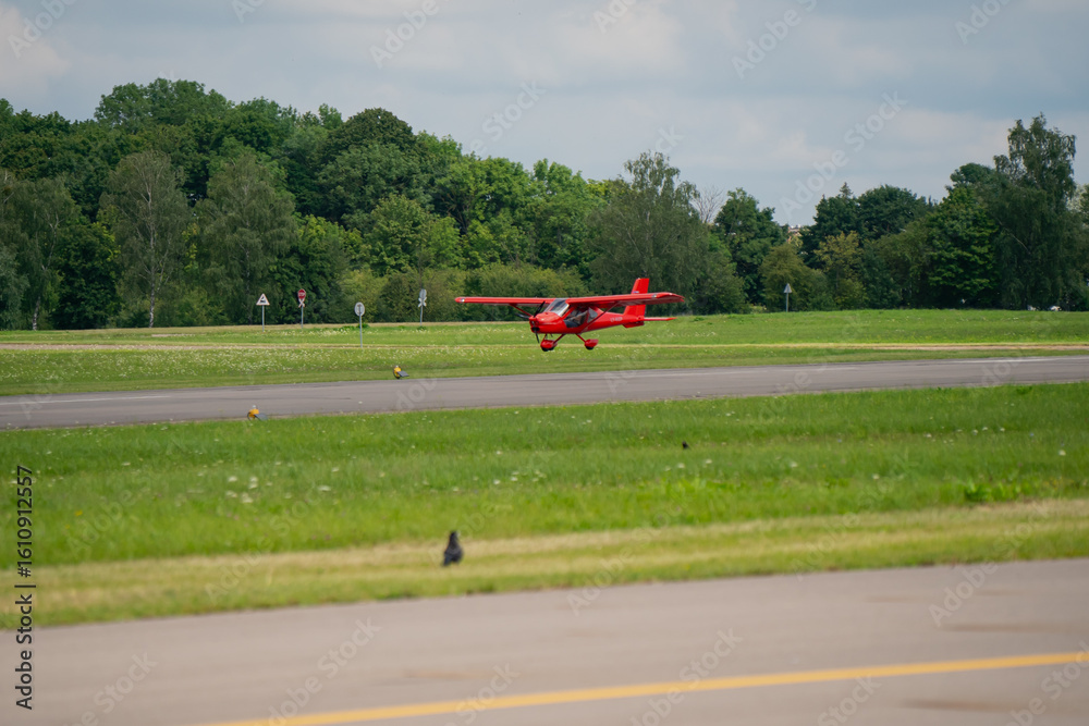 Red small airplane taking off from airport runway surrounded by green grass field and forest background. Flyway road of landing and departures for airplanes
