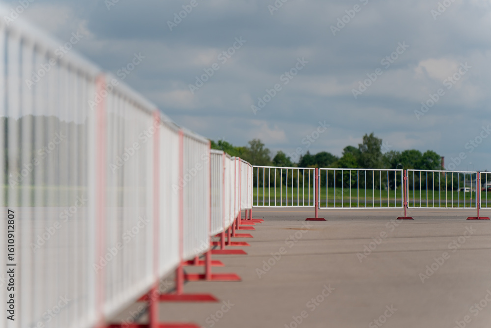 Temporary crowd control fencing with red metal bases on airport apron with blurred background and safety barrier perspective