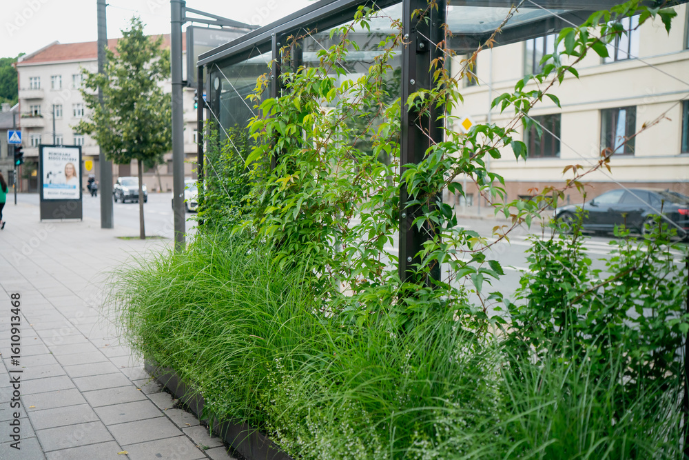 Urban green wall with climbing plants and tall grass on city sidewalk near glass structure promoting sustainable architecture and eco-friendly public space design