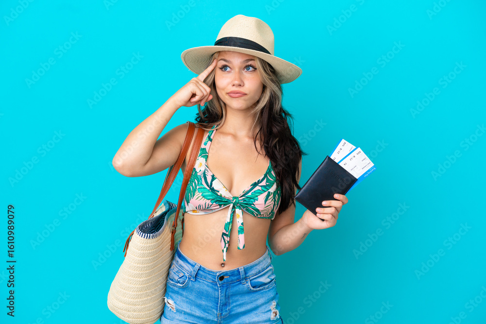 Teenager Russian girl in bikini holding a passport isolated on blue background having doubts and thinking