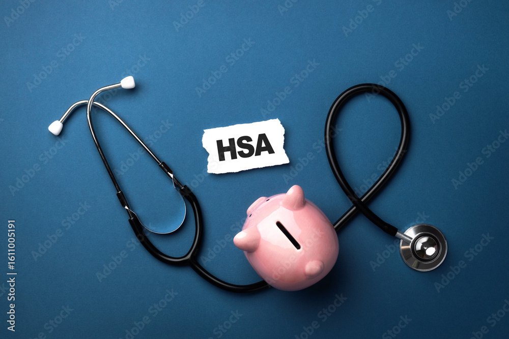 Stethoscope wrapped around pink piggy bank with "HSA" written on piece of paper on blue background symbolizing health savings accounts. Top view, flat lay.