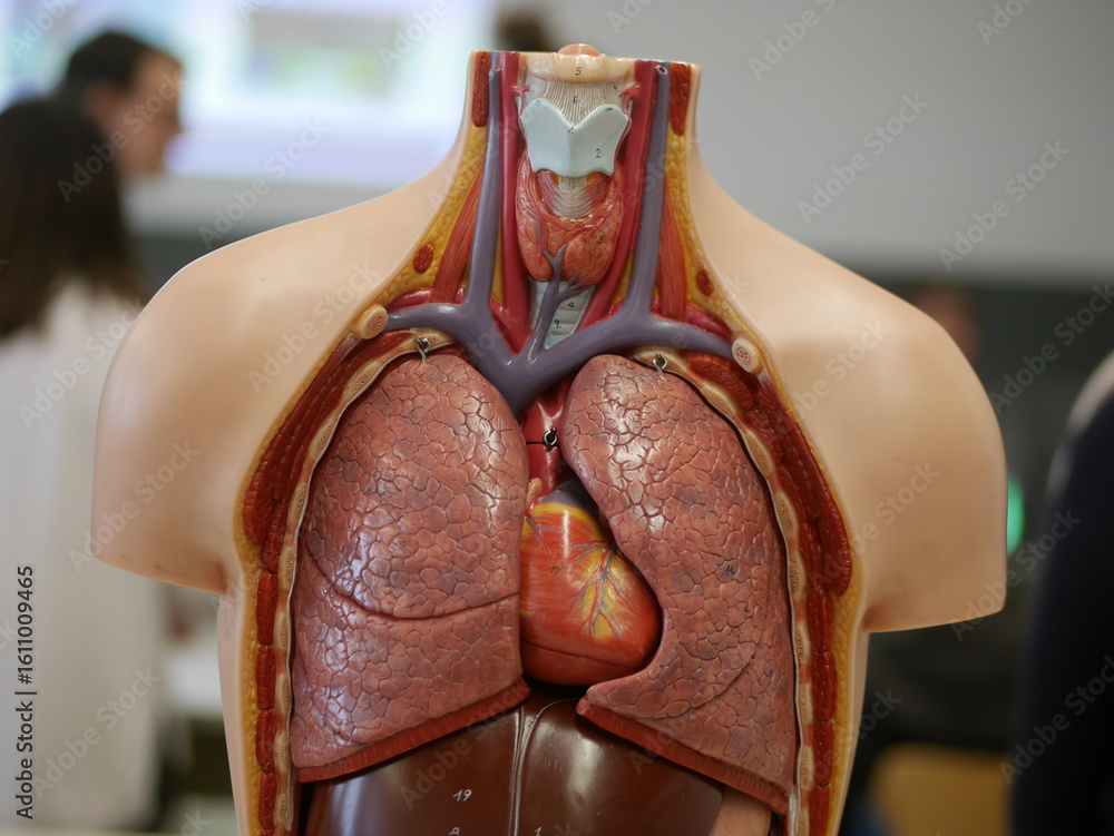 Model of a human body with a red heart and lungs