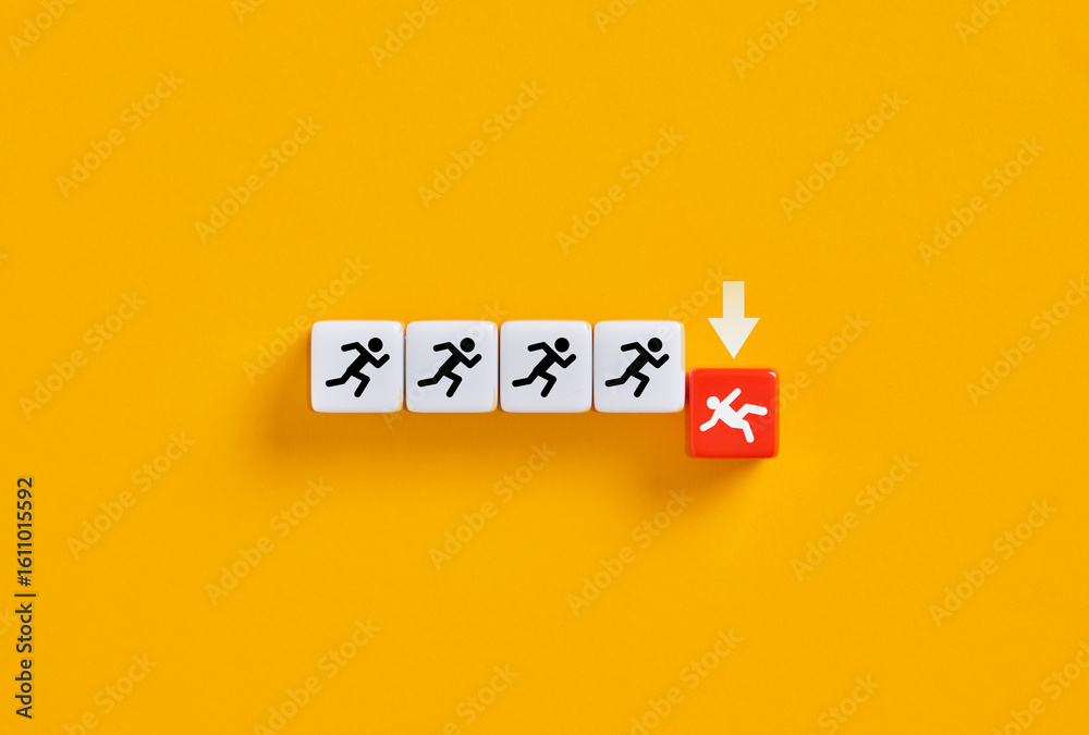Businessman falling behind while others are running forward on cubes