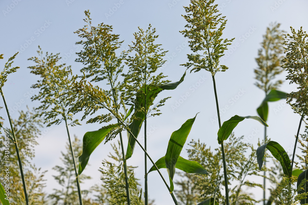 Tall sorghum plants with green leaves and seed heads against a clear blue sky