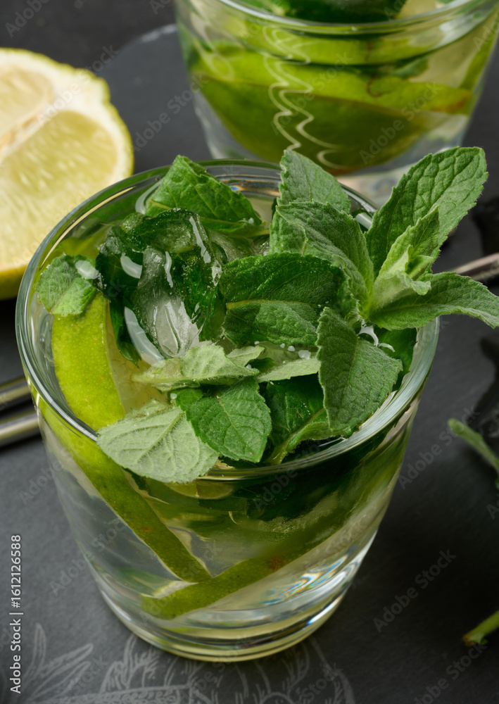 Refreshing mojito cocktail with lime, mint, strawberry, and ice on dark background, top view