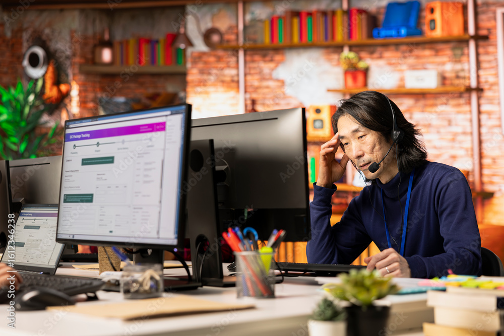 Call center agent tracking shipments at work, looking at computer screen, handling delivery delays. Asian customer center worker using software to locate clients packages and provide status updates