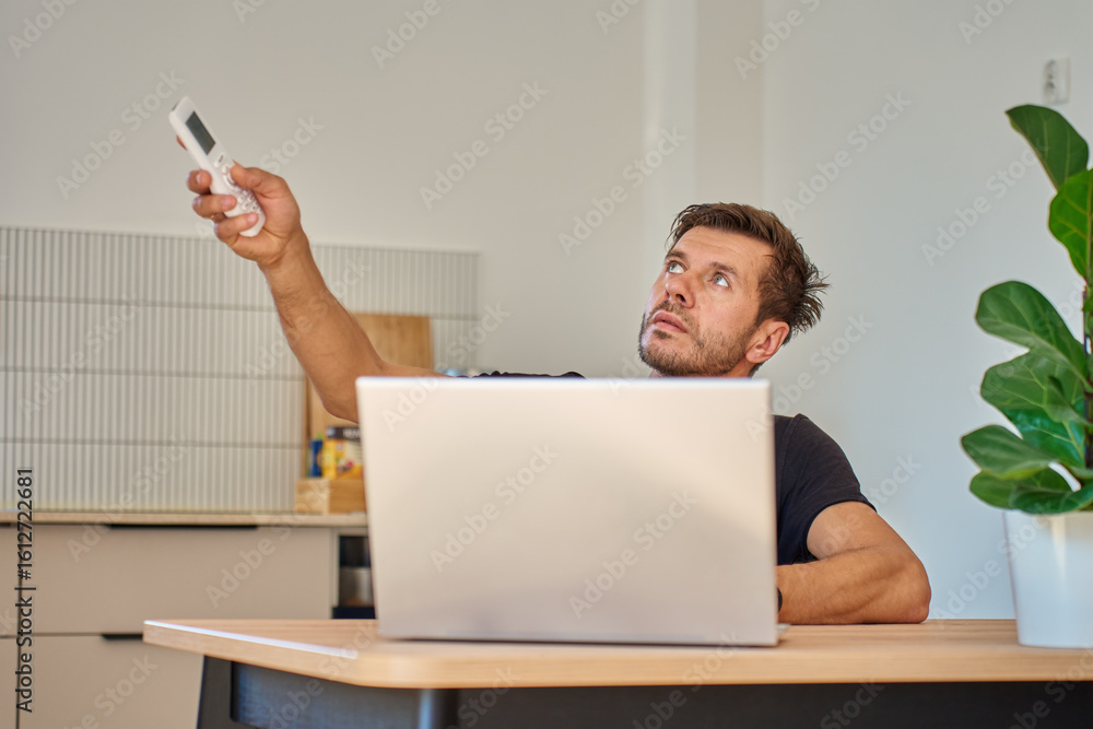 Man working on laptop at home and using remote control to adjust temperature on air conditioner. Person struggling with heat while working at home office