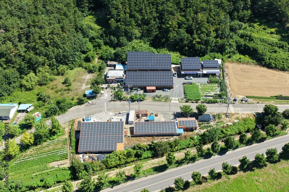 Aerial View of Rooftop Solar Panel Installation on Rural Business and Residential Buildings – 농촌 주택 및 소규모 사업장 지붕의 태양광 패널 설치 드론 촬영