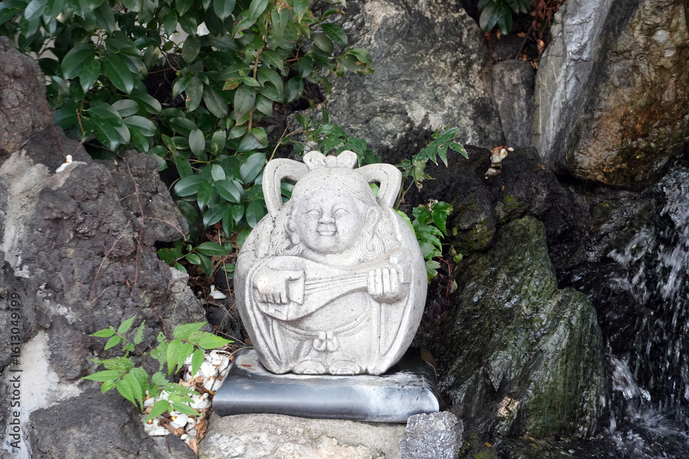 A beautiful stone statue plays music next to a gentle waterfall in a garden setting.