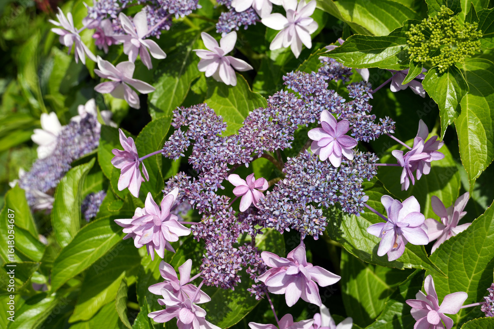 Beautiful purple and white Hydrangea serrata flowers bloom among lush green leaves.