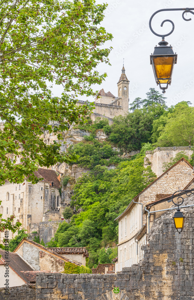 Vertical photo of the famous cliffside village of Rocamadour in the Occitanie region of France