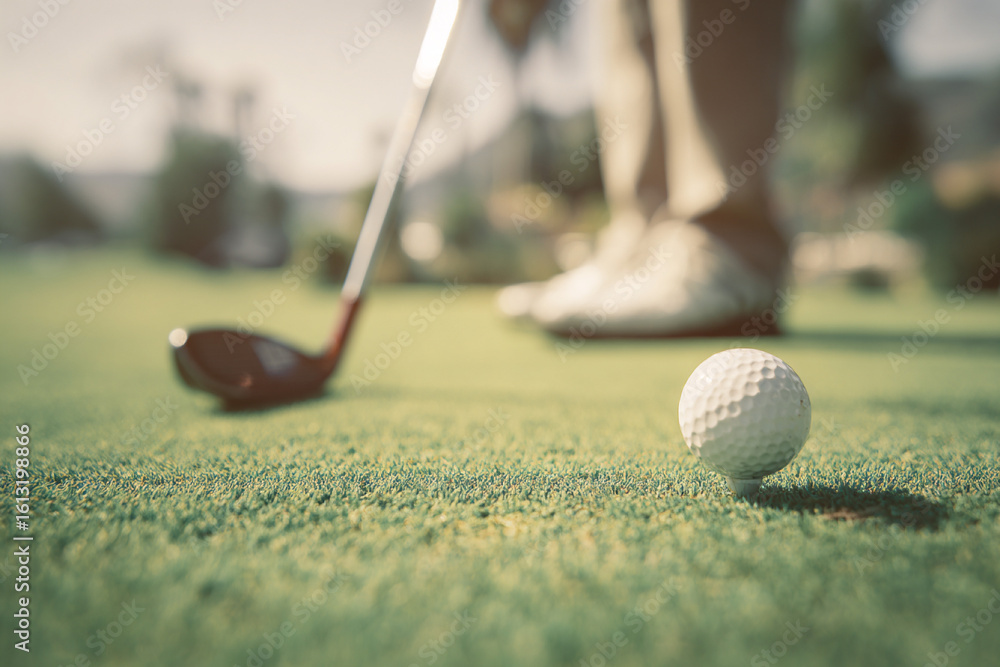 A close-up of a golf ball on a tee with a golf club and a player's feet in the background.