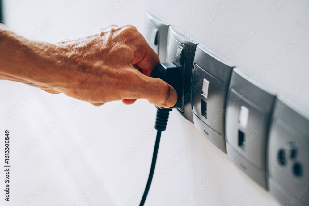 Hand plugging a black electrical plug into a wall socket. Several sockets are aligned on a white wall in a modern interior.