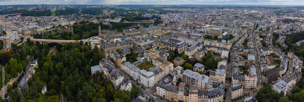 Aerial view of the old town of the capitol city Luxembourg in Luxembourg on a cloudy spring day