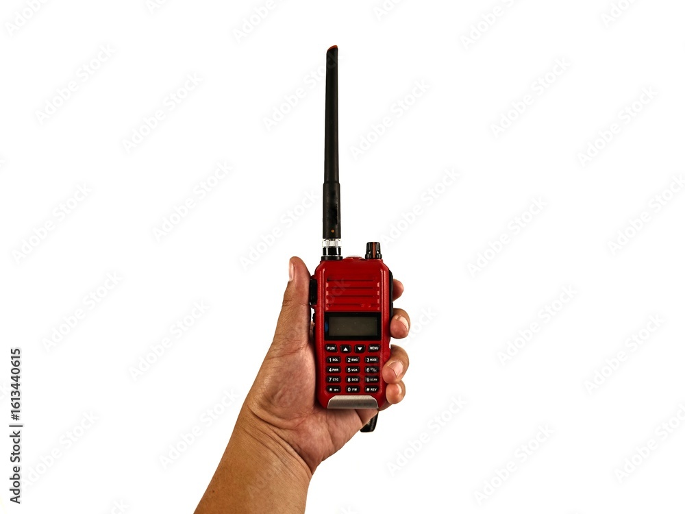 Hand Holding Red Walkie Talkie Radio on White Background