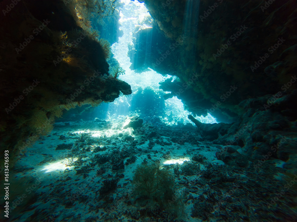 Landscape view of sunlight sunbeams dancing from the surface in underwater sea cave with rock walls