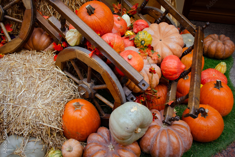 Large orange pumpkins emptied a rustic cart. Big harvest concept, Thanksgiving, Halloween, card with space for text.