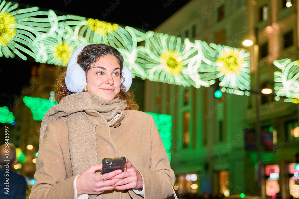 Young woman using smartphone under christmas lights in city center
